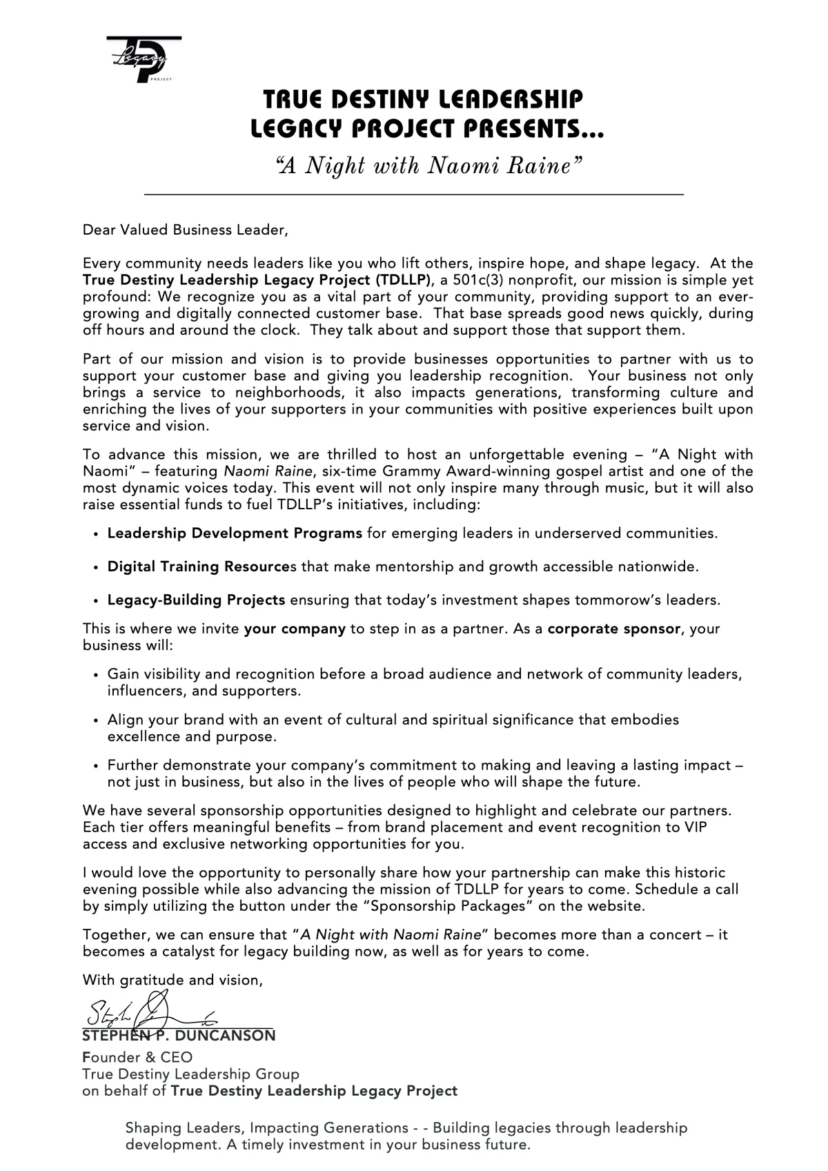 Subject: Partner with Us for A Night with Naomi Raine — Building Legacies Through Leadership Development. A timely investment in your business future.